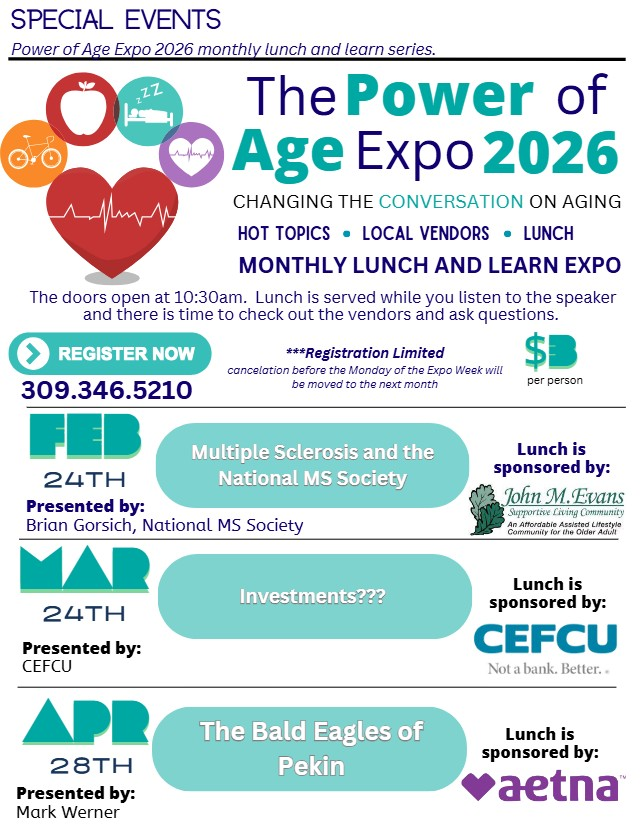 March 24, 2026 @ 10:30 - 12:00pm POWER OF AGE EXPO 2026 Miller Senior Center 551 S 14th St., Pekin We are changing the conversation on aging with our Power of Age Expo 2026! March 24, our topic is: “Investments???” presented by CEFCU Monthly Lunch and Learn EXPO. Lunch is served while you listen to the […]